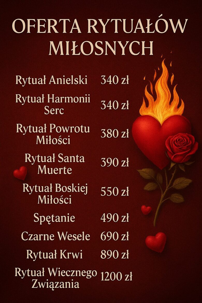 Rytuał premium czarnej magii wykonywany przez 30 dni. To połączenie kilku technik, w tym elementów spętania, energii ognia i więzów karmicznych.